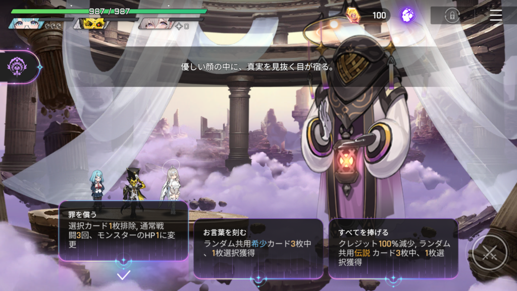 ランダムな効果が3つ出現するので「選択カード排除」を含む選択肢を選びましょう。