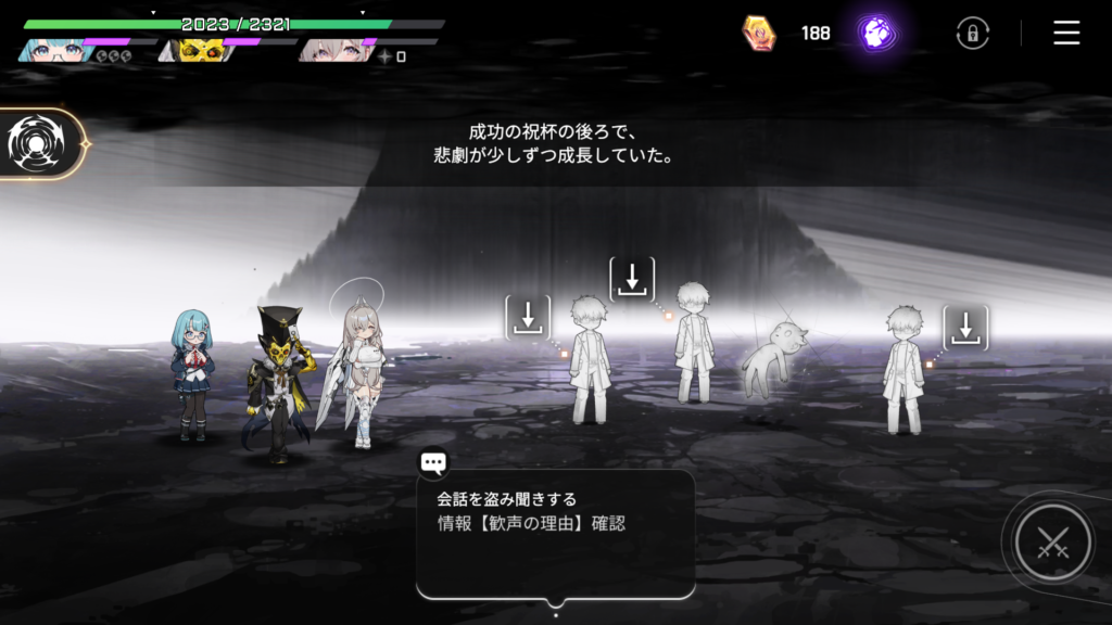 うまみは少ないですが「祝杯の記録」の真ん中の選択肢でランダムのニヒルムヒラメキ(神ヒラメキ)が発生します。