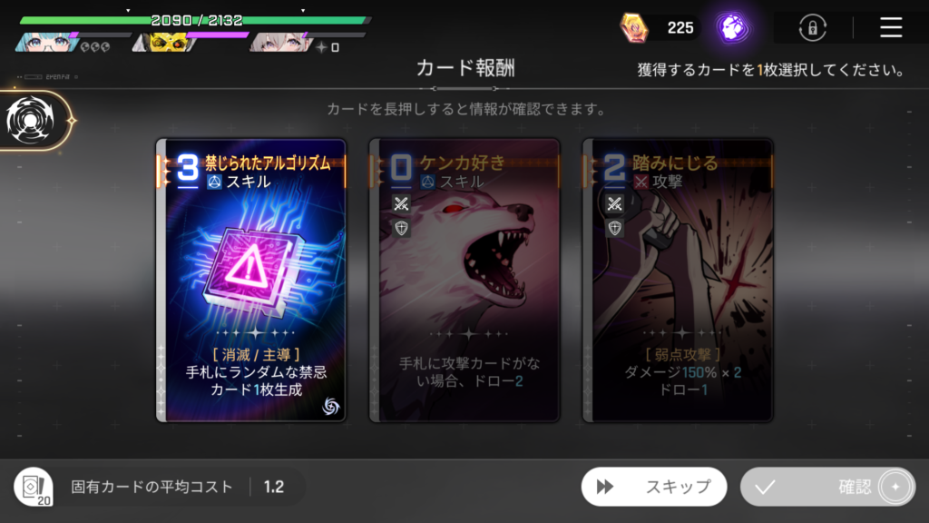 コピー候補はランダムですが、道中のイベントやデランショップのカード排除を活用して候補を絞っておけば、ある程度当たりの確率を引き上げられるでしょう。