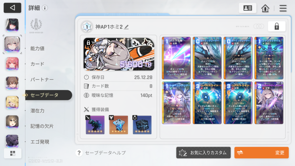 最後に現在使用している後発隊のセーブデータも掲載しておきます。