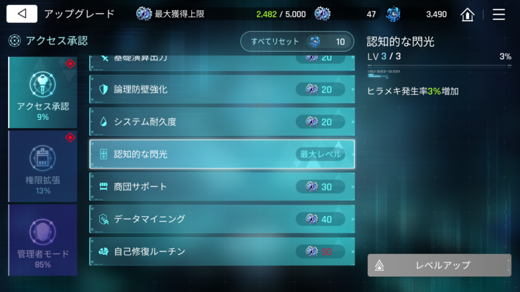 ヒラメキの発生率が最大レベルで3%増加します。
