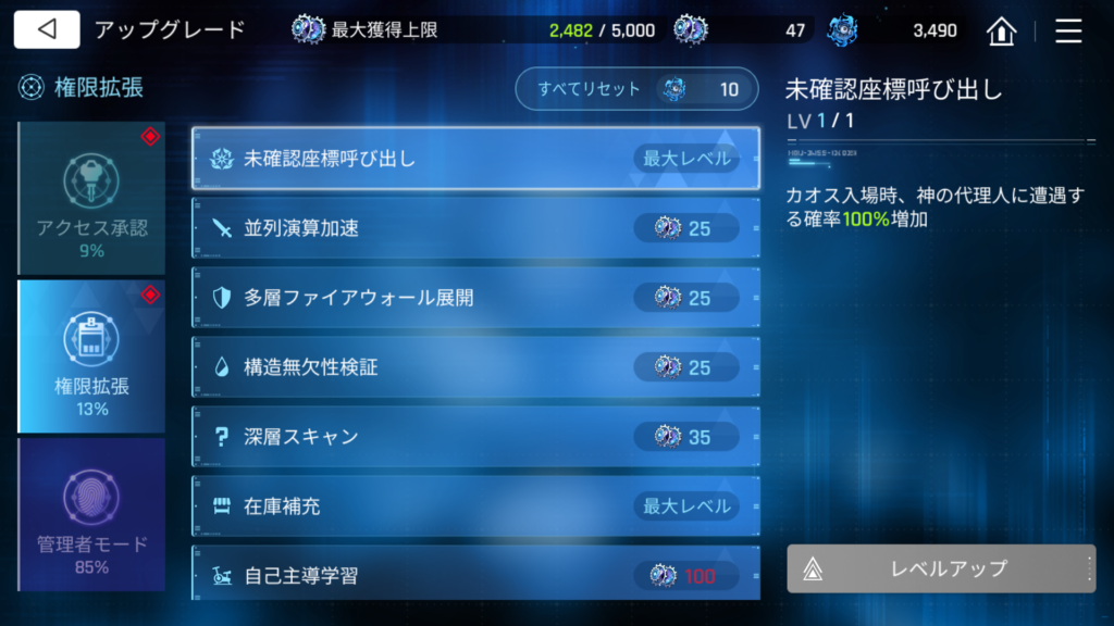 リセットを実行すると、解放した項目がレベルアップ可能な状態で残り、使用したカオスアーキテクトが返還されます。