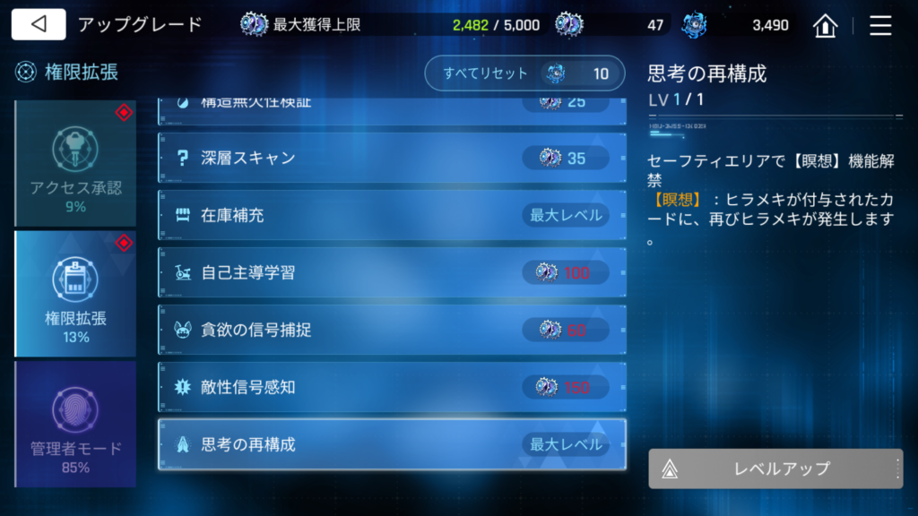 解放するとセーフティエリアで機能が使用でき、既にヒラメキが付与されているカードのヒラメキを再抽選できます。