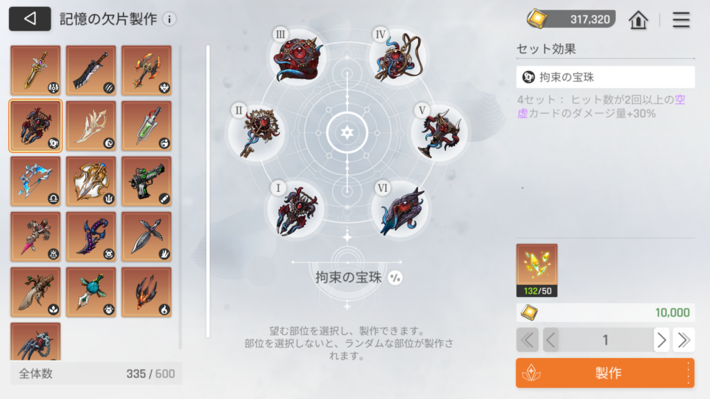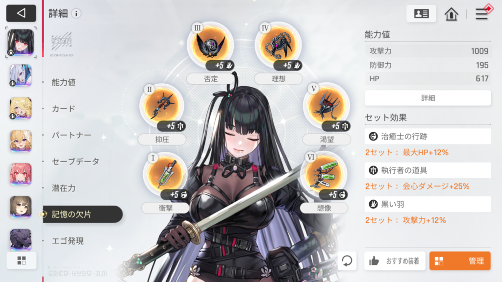 記憶の欠片は「治癒士の行跡」「執行者の道具」「黒い羽」の2セット×3構成。