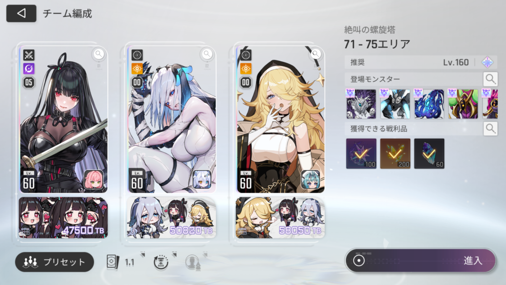 進入!とは言ったものの、螺旋塔71-75エリアはマグナをメインとした編成で解説しているので、詳細なギミックや立ち回りはそちらをご覧ください。