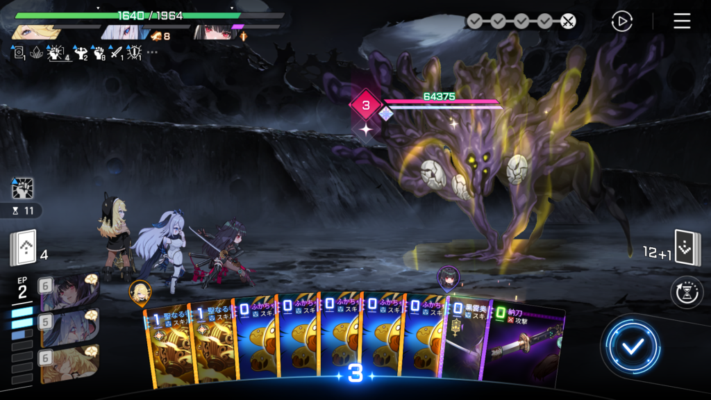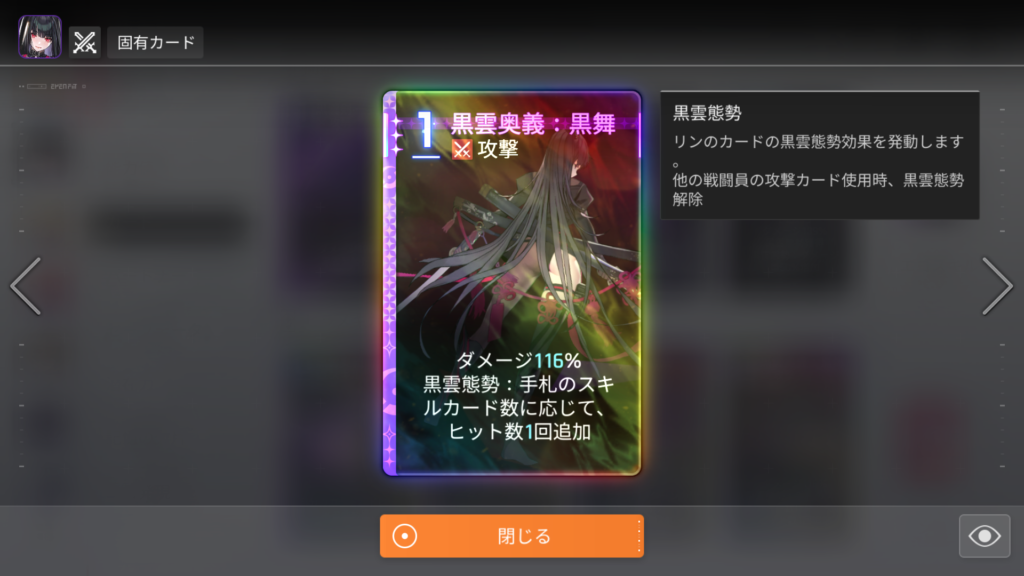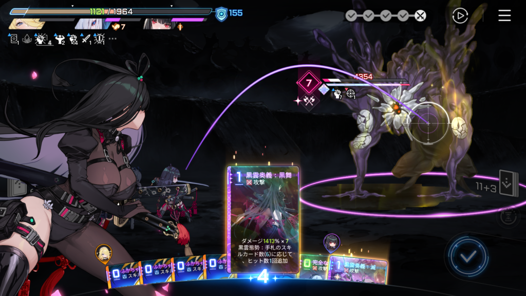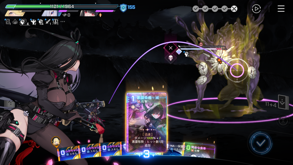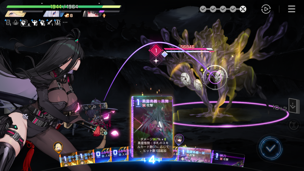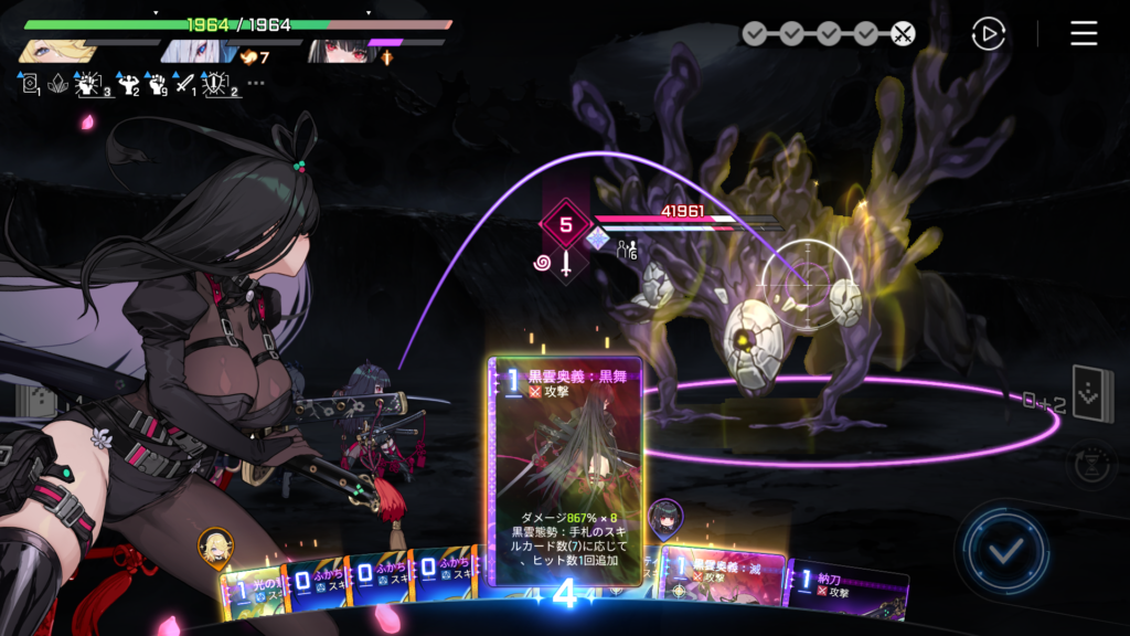 ふかちゃんでバフを貯めて、ヒット数を増やしつつ、最大出力の「黒雲奥義:黒舞」を放ちます。