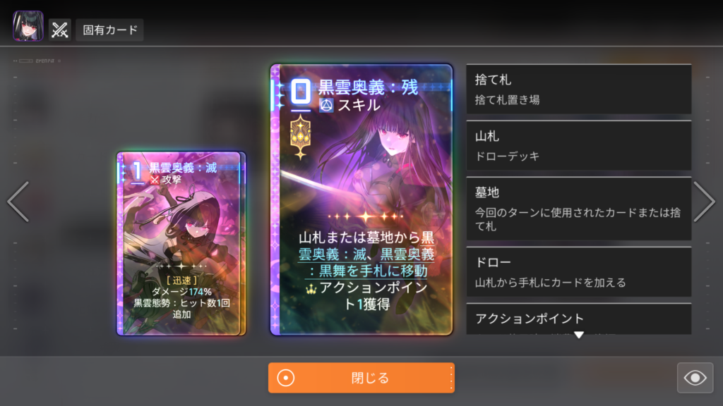「黒雲奥義:滅」「黒雲奥義:黒舞」を山札または墓地から手札に移動する+アクションポイント1獲得。