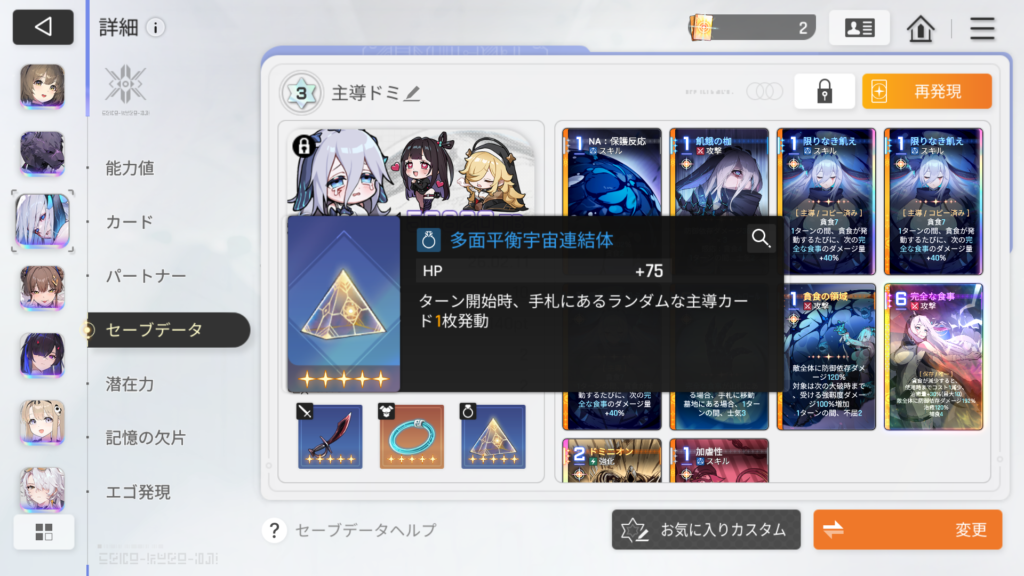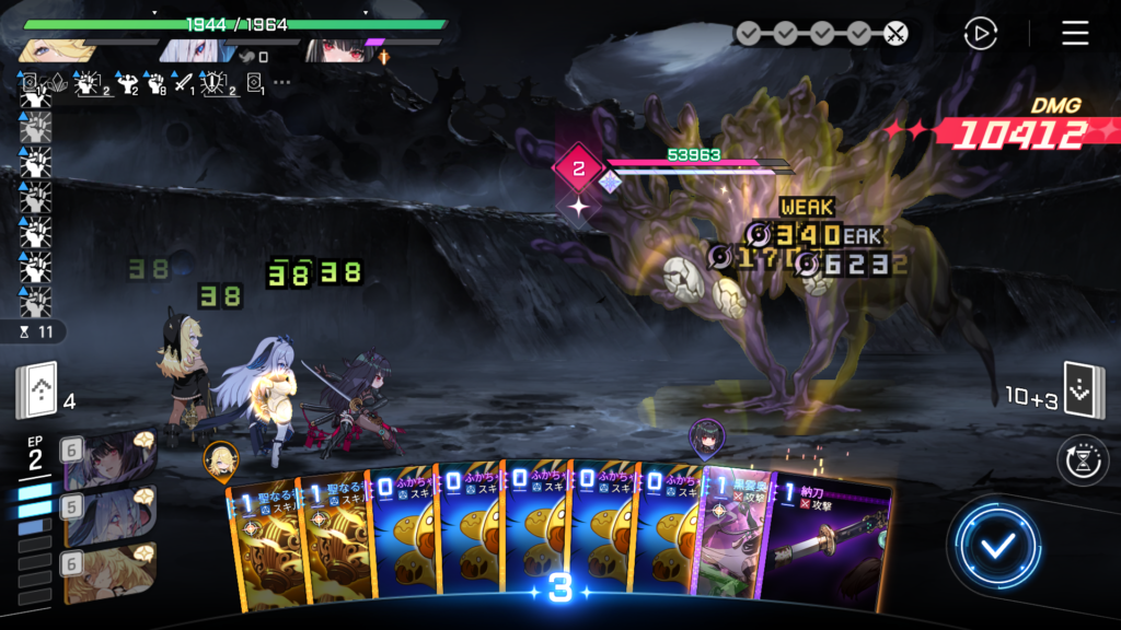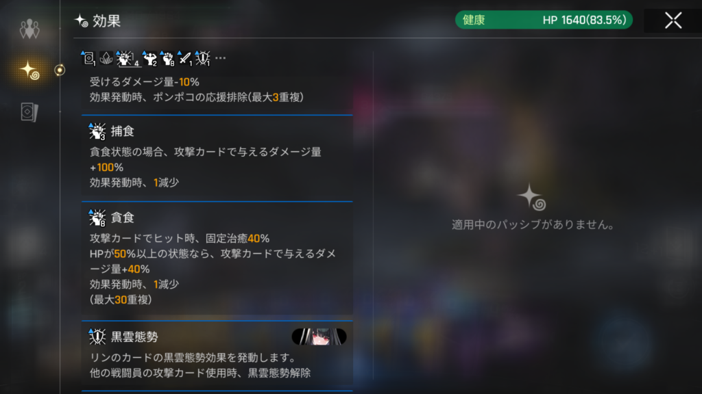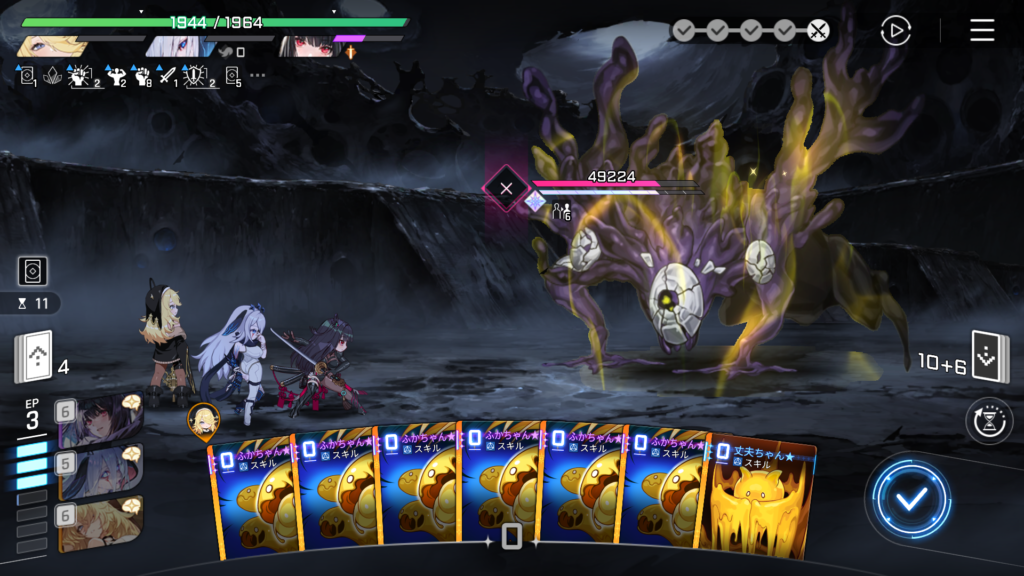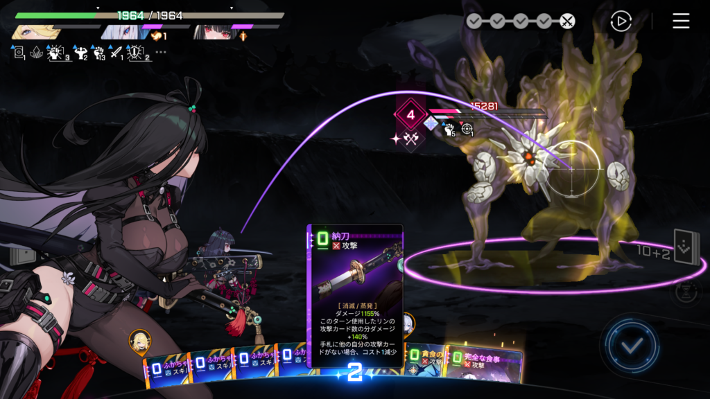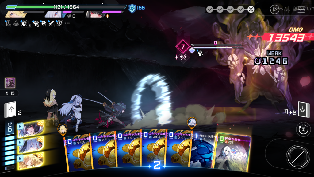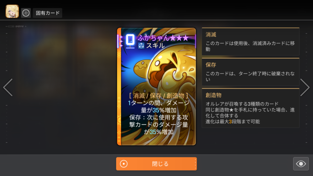 「ふかちゃん:保存」によるバフは直後に使用した攻撃カード1枚にまとめて掛かって消費されるため、一度攻撃カード使用するとリセットされます。
