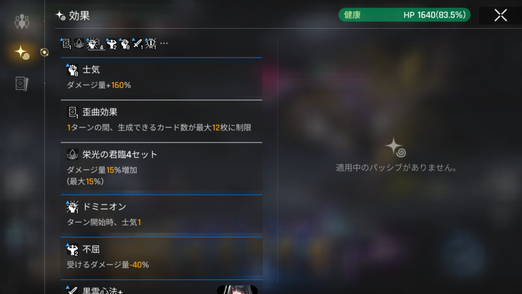 「士気8(ダメージ量+160%)」「ふかちゃん:保存(攻撃カードのダメージ量175%増加)」。