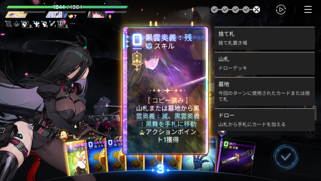 前のターン同様、「黒雲奥義:残」で手札に移動させた「黒雲奥義:黒舞」は1コスト11893ダメージ。