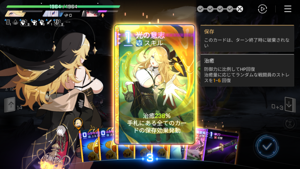 しかし「ふかちゃん」の枚数を減らさず「光の意志」を発動すれば、同じ量の「ふかちゃん:保存」のバフを次の攻撃カードにも掛けられます。