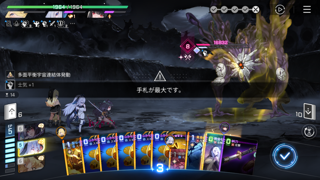 絶叫の螺旋塔は1度の挑戦で5回の戦闘が発生しますが、戦闘に切れ目はなく、1度発動した強化カードの効果は挑戦終了まで持続します。
