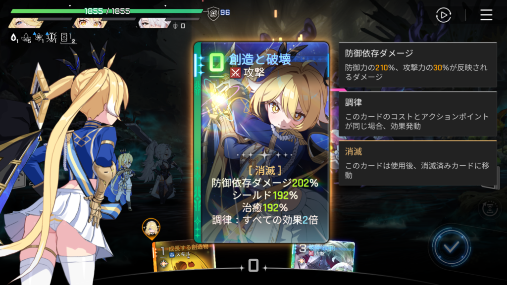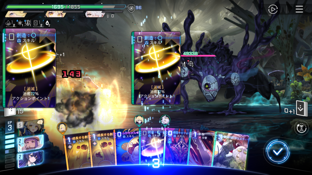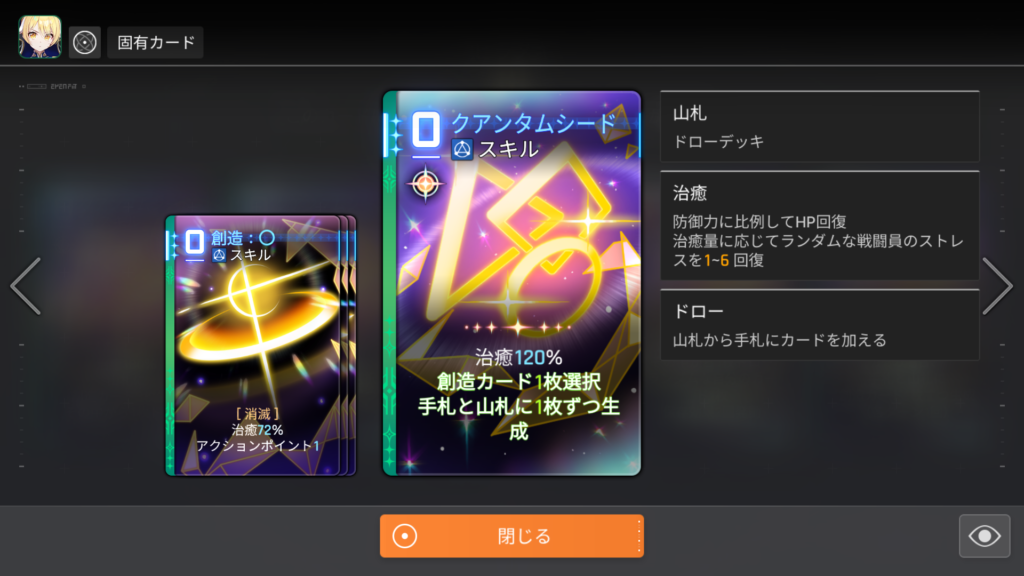 この状態で「治療72%」の効果がある「創造:〇」を発動させてみましょう。